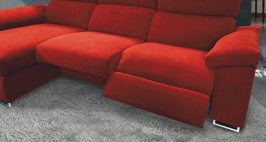 Sofá relax modular con chaise longue, cabezal reclinable, reposapiés y motor relax opcional.